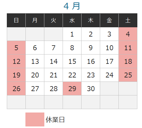 弊社の4月の休業日は下記の通りです。